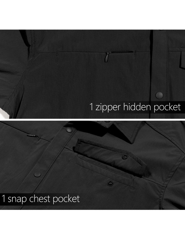- GREAT FOR OUTDOORS: 1 zipper chest pocket and 1 zipper hidden chest pocket with classic design. Summer roll-up sleeve shirt with fashion snap button design is great for a day of hiking, traveling and climbing